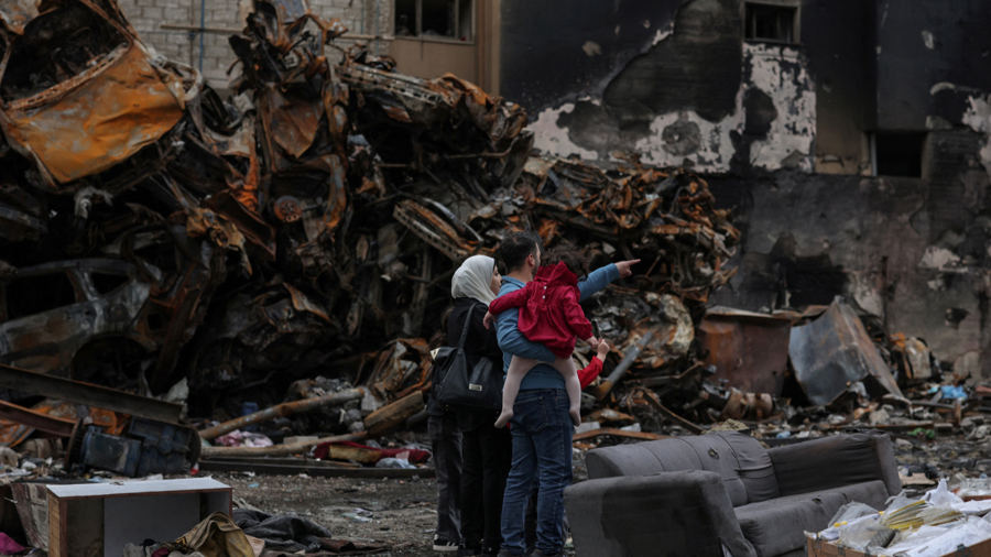 4月19日,在黎巴嫩贝鲁特,一家人查看4月8日遭以军袭击的建筑。\n 新华社发