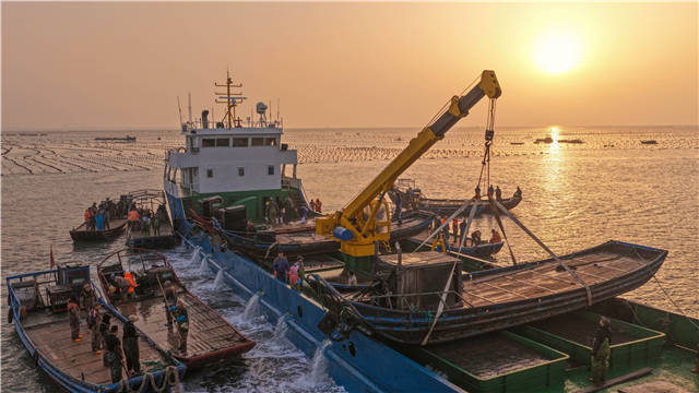 在现场,养殖工人正在将一个个黑色的鲍鱼笼,从大船转运到小船上,将这些“候鸟鲍”及时投放到的养殖海域,开启新一轮生长。